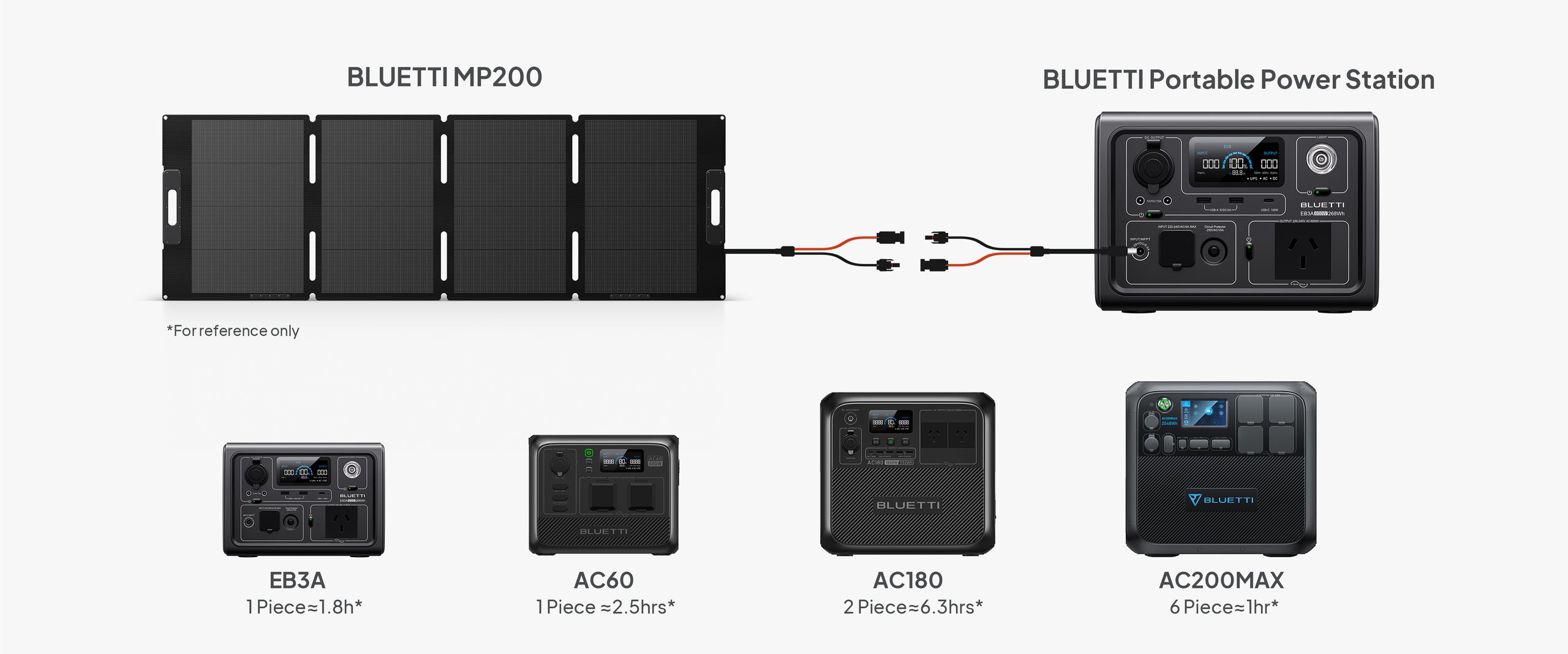 To get the maximum efficient solar panel system, we recommend you use solar panels of the same type and from the same vendor. For example, two MP200 charging BLUETTI AC200P is acceptable, while one PV200+ one MP200 is not suggested.