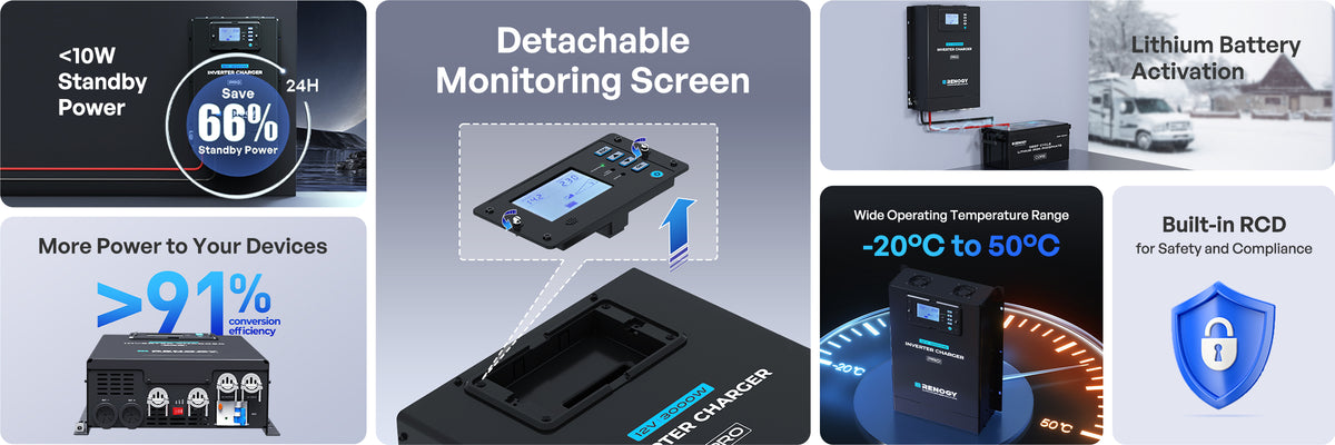 The Renogy Pro 12V 3000W HF Inverter Charger delivers high-efficiency 12V DC to 240V AC conversion in a compact, lightweight design. Perfect for RVs, caravans, boats, and off-grid cabins, it combines pure sine wave inversion with intelligent battery charging and built-in RCD protection. The detachable LCD panel and optional BT-2 Bluetooth module enable convenient remote monitoring via the DC Home app.With over 91% efficiency, ultra-low standby power (<10W), and a rapid 20ms transfer time, this all-in-one unit ensures uninterrupted power and maximum energy savings for both mobile and backup applications.Key Features