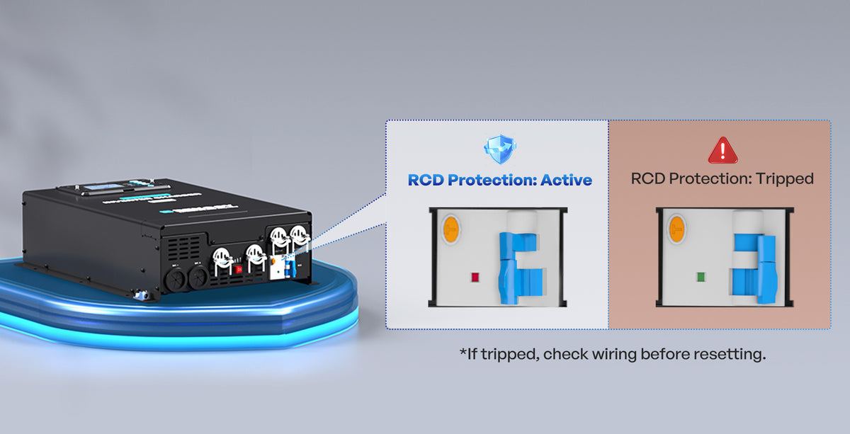 The inverter includes a Residual Current Device that instantly detects earth leakage, cuts output power, and can be reset with the front switch—no external RCD required.